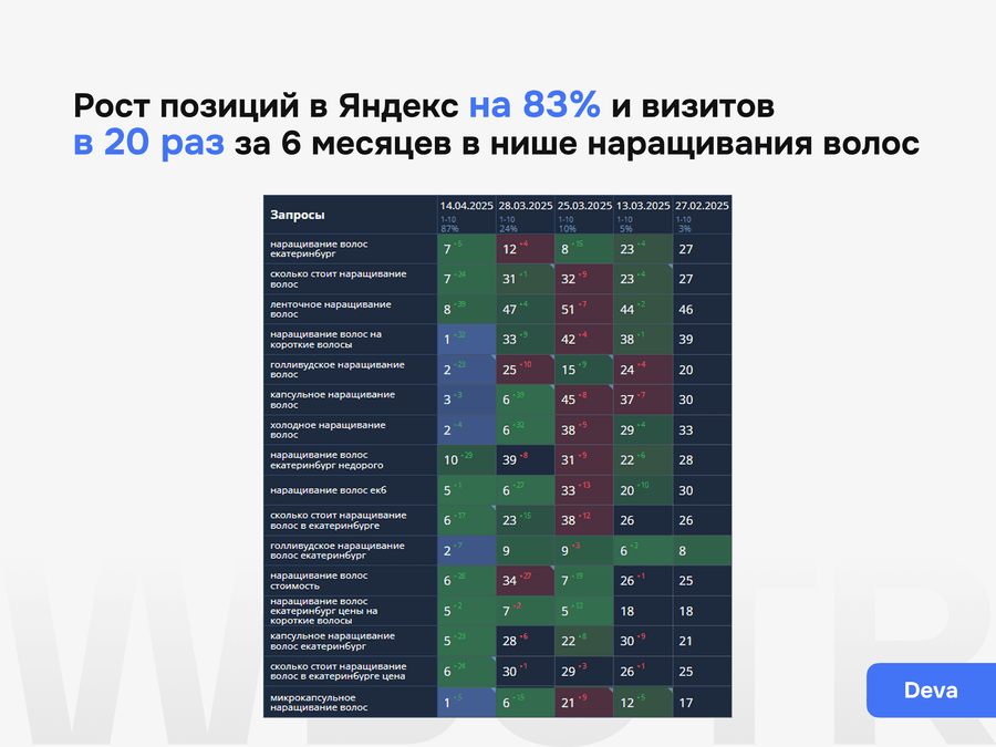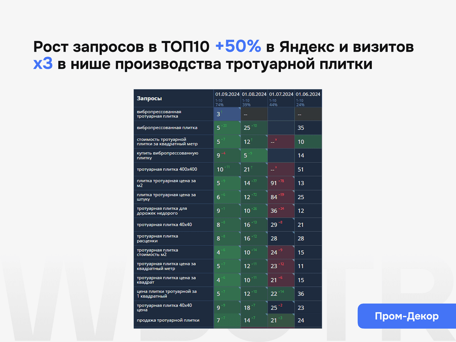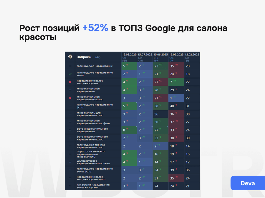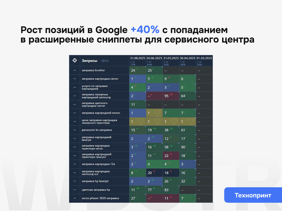 Показываем не только рост видимости или трафика, но и то, как SEO влияет на обращения, стоимость лида и эффективность коммерческих страниц. Это делает продвижение управляемым и понятным для собственника, маркетолога и отдела продаж.
